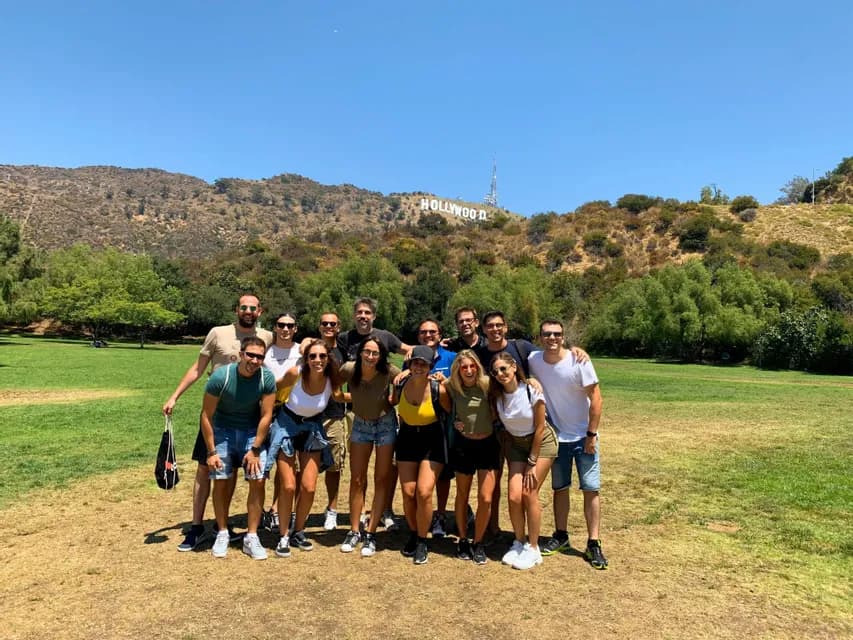 Un viaje en grupo de WeRoad posando para una foto en un parque con césped, con el letrero de Hollywood en una colina al fondo bajo un cielo despejado.