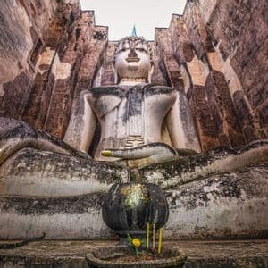 Una colosal y desgastada estatua de Buda de piedra se encuentra en meditación entre altos muros de piedra, con un pequeño cuenco de ofrendas delante.